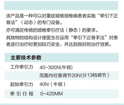 YHZ-12D型頸腰椎牽引床,由微電腦控制,輕觸鍵輸入程序,可根據(jù)患者病情連續(xù)、間歇、往返、脈沖牽引,具有牽引力自動補(bǔ)償,自動計時等提示功能。
