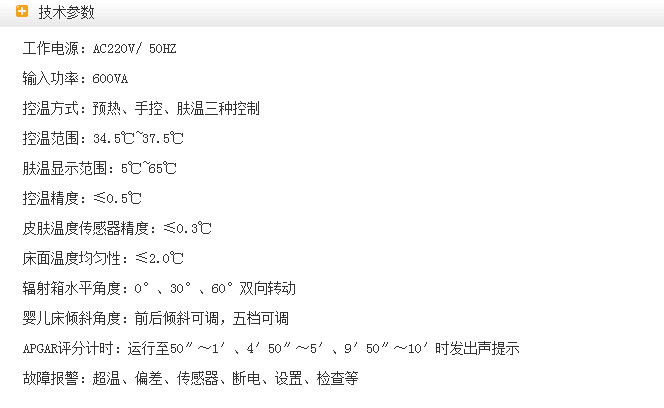由輻射箱、控制儀、嬰兒床、托盤、機(jī)架、皮膚溫度傳感器、輸液架。