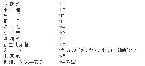 1、床 墊 1張 2、邊欄(護(hù)欄) 4件 3、鹽水瓶架 1件 4、引流鉤 1件