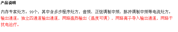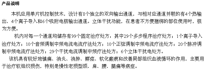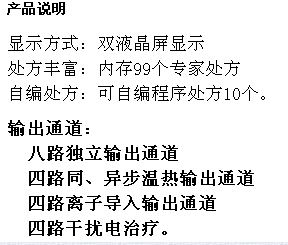 本機(jī)采用微電腦控制技術(shù),由中、大規(guī)模集成電路組成,設(shè)雙通道輸出,并具有各種顯示功能。 機(jī)內(nèi)存貯的35個(gè)特定系列程序處方,醫(yī)生依患者病況選擇治療處方。當(dāng)處方選擇好后,啟動(dòng)儀器,即可自動(dòng)地按程序輸出有特定治療作用的系列中頻電流。輸出電流大小可自由調(diào)節(jié)。當(dāng)處方程序運(yùn)行結(jié)束時(shí),儀器自動(dòng)切斷輸出電流,并發(fā)出音響提示。 本機(jī)還具有中藥透入功能,當(dāng)將浸有中藥藥液的布?jí)|墊在電極與皮膚之間,或?qū)⒅兴幩幰和坑陔姌O表面后放置在皮膚上,選擇相應(yīng)的治療處方,就可進(jìn)行中藥透入治療。