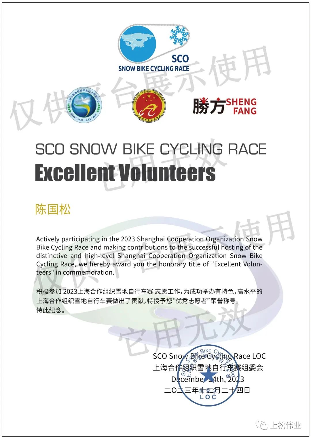 這里是哈爾濱,是“奧運冠軍之城”,是中國冰雪運動的發(fā)源地,也是中國雪地自行車賽的發(fā)祥地。2023上海合作組織雪地自行車賽落戶冰城,一切似乎是一場順其自然的巧合,而來自8個國家的自行車猛將也在這里展開了一場速度與耐力的比拼。我公司總經(jīng)理陳國松同志積極參加此次活動并獲得“優(yōu)秀志愿者”榮譽稱號。