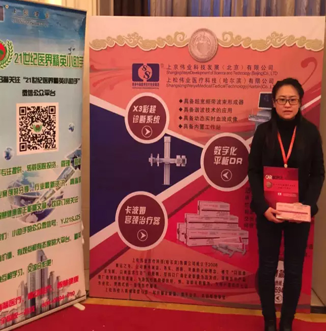 東北區(qū)銷售經(jīng)理張婷女士手拿公司資料手冊與公司主打產(chǎn)品卡波姆宮頸治療器在展板前合影