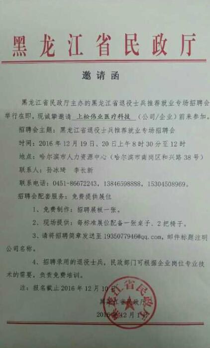 我司受黑龍江省民政廳邀請(qǐng)參加黑龍江省第五屆退役士兵推薦就業(yè)專(zhuān)場(chǎng)招聘會(huì)