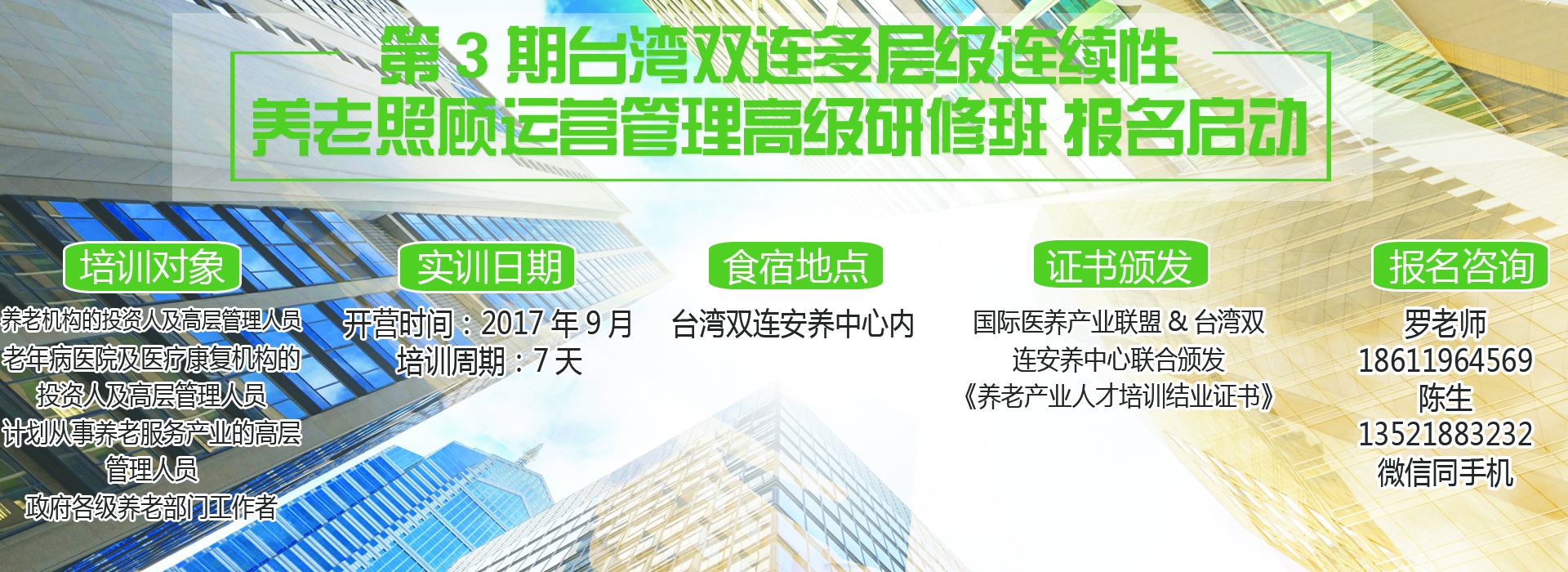 國際醫(yī)養(yǎng)產(chǎn)業(yè)聯(lián)盟為提升國內(nèi)養(yǎng)老服務機構的服務品質(zhì),幫助目前正在經(jīng)營養(yǎng)老照顧服務的機構及未來計劃從事老年養(yǎng)護事業(yè)的投資及經(jīng)營管理者,特聯(lián)合臺灣雙連安養(yǎng)中心研發(fā)此次培訓項目,選派養(yǎng)老事業(yè)投資及經(jīng)營管理者前往臺灣雙連安養(yǎng)中心現(xiàn)場觀摩學習,在雙連安養(yǎng)中心的精英師資的帶領下,使每位學員充分領悟臺灣老年照護事業(yè)服務精髓及永續(xù)經(jīng)營理念。