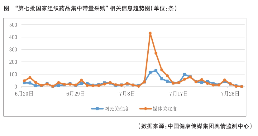 6月20日至7月28日,中國(guó)健康傳媒集團(tuán)食品藥品輿情監(jiān)測(cè)系統(tǒng)對(duì)主流媒體、全國(guó)性門戶網(wǎng)站、微博、微信等平臺(tái)進(jìn)行監(jiān)測(cè)發(fā)現(xiàn),“第七批國(guó)家組織藥品集中帶量采購(gòu)”相關(guān)話題受到輿論較多關(guān)注,相關(guān)輿情熱度較高。
